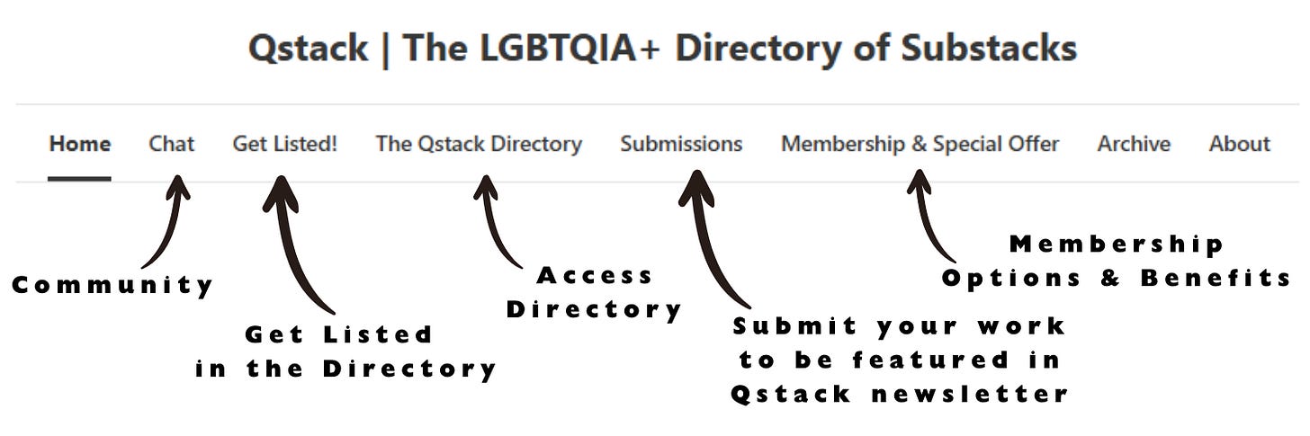 For those new to Qstack or long-time supporters who just need a reminder of how it all works, here is a handy overview of what Qstack, the LGBTQQIP2SA+ Directory of Substacks has to offer, and how to access these resources.